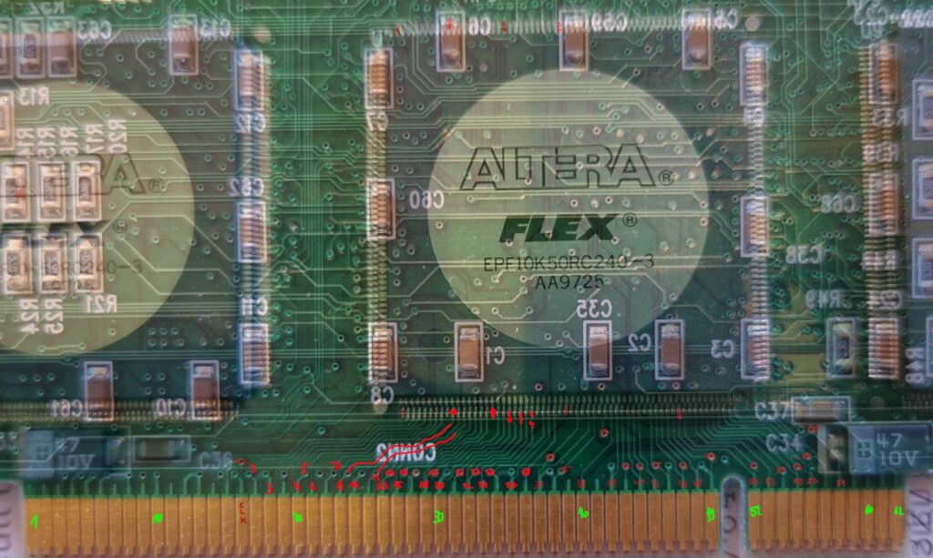 The only option was the reverse-engineering of the card. So I made pictures from the front and back of the PCB, overlayed them in Paint.Net and tried to figure out the individual connections between the PCI-connector and the PLD in the center: