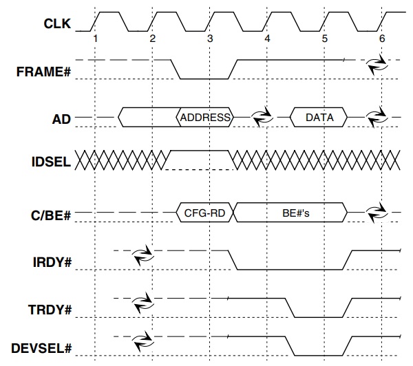 - read address (a DWORD-address of config-space while first two bits must be “0”) and check command on asserted nFRAME