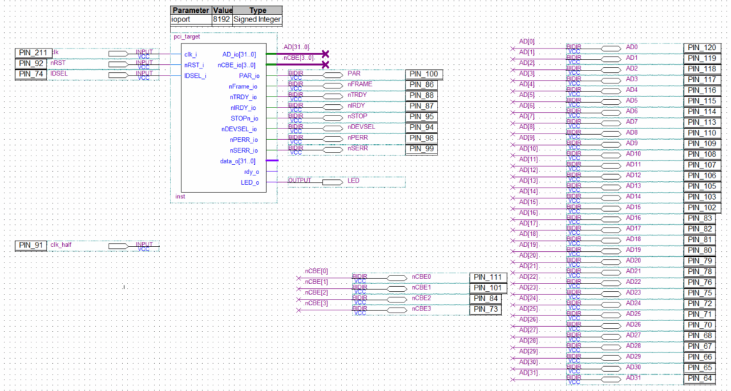 As the PCI-clock with 33MHz is connected to the input, the individual outputs Qx of the PLL are connected to the individual PLD-chips. The FLEX10K which is responsible for the PCI-communication is connected to Q0 (33 MHz) and Q/2 (16.5MHz). With this knowledge, I was ready to dive into the PCI-specifications as the hardware is ready for some logic…