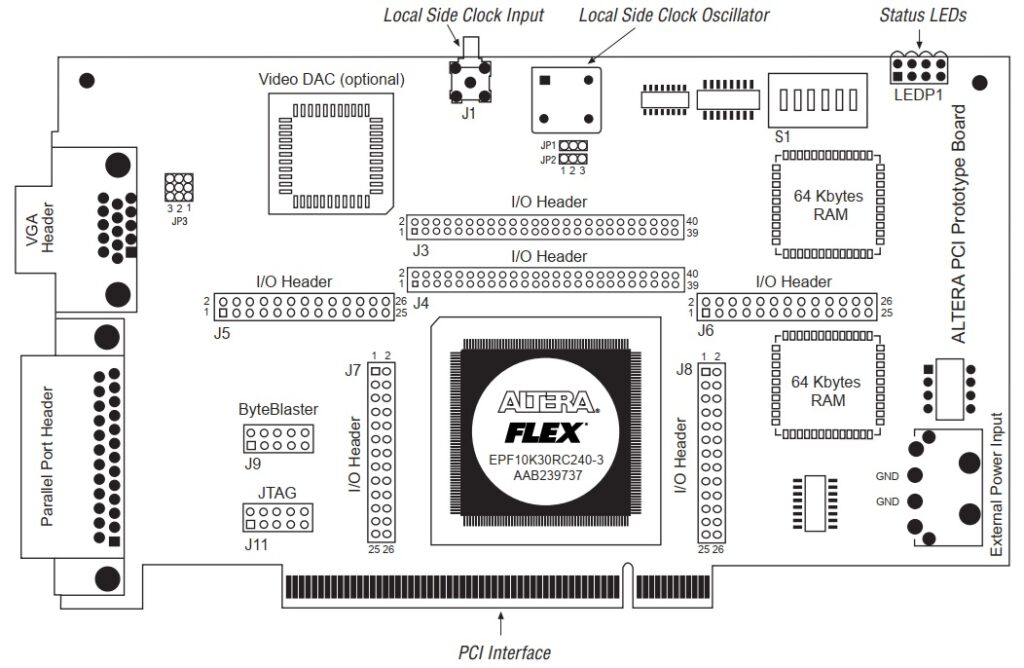 Last time I reverse-engineered an old Altera development-board I’ve found on eBay. Unfortunately there was absolutely no documentation about this card so I had to track all traces on the PCB by myself. Of course, I contacted some guys on Altera/Intel, but they couldn’t help me as all old documents had been deleted. But they had another development-board for me – together with a helpful PDF-document: a FLEX 10K PCI Prototype Board with a single EPF10K30RC240-3 FPGA. The board has two 32kB SRAM-ICs, a VGA-Connector and lot of I/O-headers.