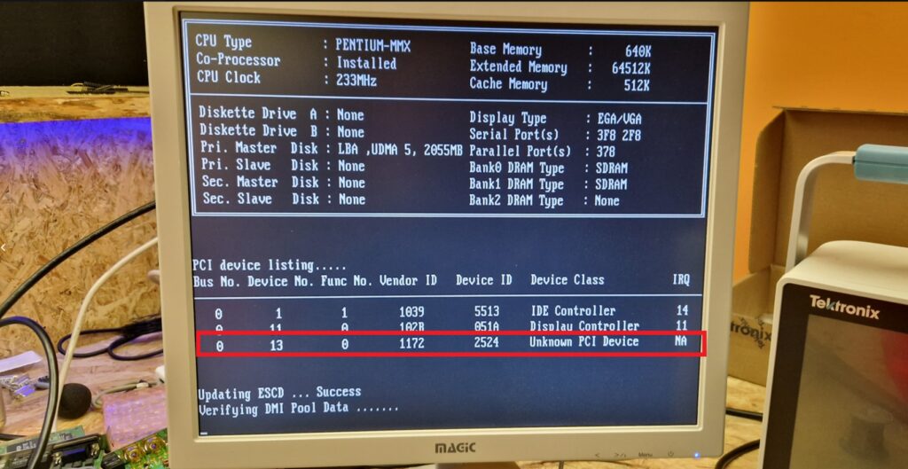 So I put the card into my Pentium 233 MMX testbench, turned on the computer, uploaded the logic to the card right after powering on and… the computer got stuck. Great. I removed lots of the logic, reuploaded the bitstream and… it started, but without recognizing my new card. Oh man. After a painful hour I realized, that I forgot to switch unused FPGA-pins to tristate by migrating the project to the new FPGA-type. Aaarrgh. So I reconfigured the unused output-pins, reuploaded the bitstream, reset the computer and: tadaaa, an “Unknown PCI Device” with my Vendor-ID 0x1172 and Device-ID 0x2524 showed up on the BIOS-screen: