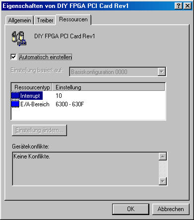 As the devicemanager of Windows98 showed an ugly yellow question-mark on my PCI card, this was the next thing on my ToDo-list. As Win9x has no driver-signature we can write our driver-files with notepad. So I started a new inf-file. Win9x only wants very few information from us, to put the device in the desired category: a general information about the driver, the VID/PID and some strings: