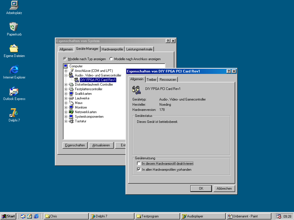 From now on the project took off. As my implementation of the configuration-space as well as the IO-space was working fine, the card was detected by the BIOS and the requested IO-range was assigned correctly. After setting the class-code to 0x048000 the card was detected as an “Multimedia Device”. For now the memory-space is prepared, but not yet tested. To test the high-level functions of my card, I installed Windows 98SE on a CF-card and the device-manager showed up the device: