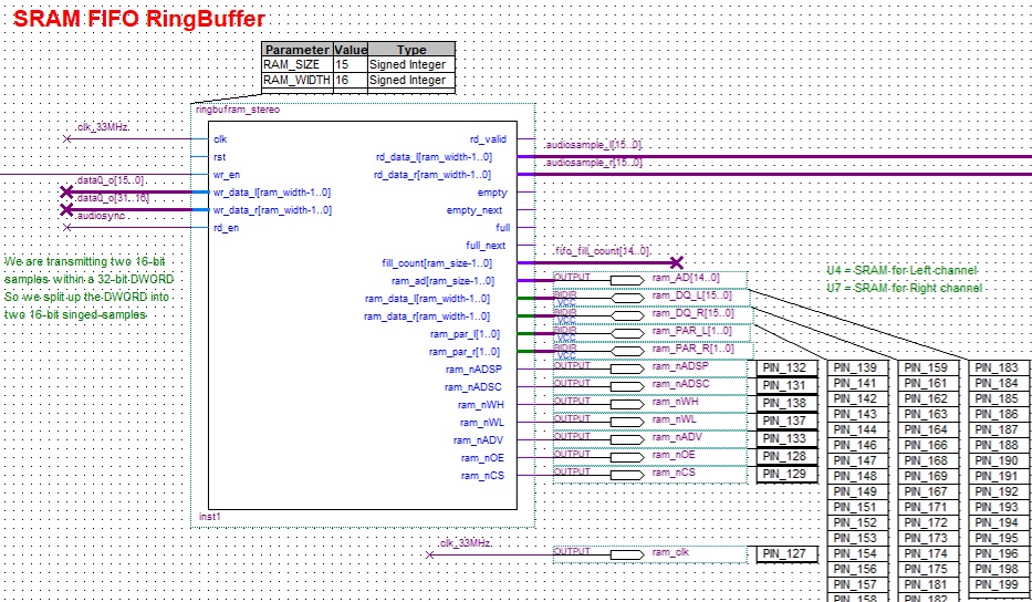 As my development-card has two 32k x 18-bit SRAM-ICs, my next idea was to create a FIFO ringbuffer using these two ICs to buffer single audio-samples for a better audio-quality. As my FPGA has too few logic-elements for a working FIFO using only block-RAM this was the only option. I will not describe the code for the FIFO-buffer in detail here. The idea is, that on writing samples to the SRAM a variable is increased to show the head of the buffer, while another variable is increased while reading the samples as the tail of the buffer. The distance between head and tail indicates the fill-level of the buffer. As storing 16-bit samples to the 32k SRAM results in a 725ms buffer I decided to use one SRAM-IC for the left audio-channel and the other SRAM-IC for the right channel to keep things easy for the start. Lateron this could be optimized to store both samples in a single SRAM. In Quartus, this looks like this:
