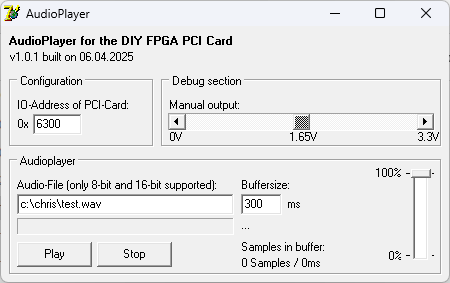 I was curious what I need to play audio-samples using this card. So I programmed a small Windows-application, that reads individual audio-samples from a standard 16-bit Wave-file. The first idea was reading the samples and send them every 22.67 microseconds to the card. As PCI uses a 33MHz clock, this should be possible. But the windows-timer has a minimal resolution of only 1 millisecond – way too long for my simple soundcard. Luckily the Win32-API offers a high-performance counter, that can be used to create much shorter delays: