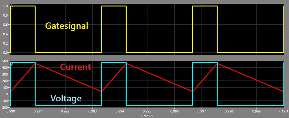 In yellow we can see the gate-signal of one of the two switches, the red-curve is the corresponding inductor-current and in blue the voltage over the inductor is shown. As the inductor-current is kept above zero, we are within the continuous-conduction-mode and we can calculate the dutycycle like this: