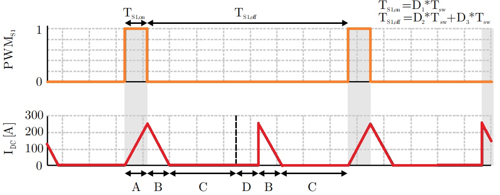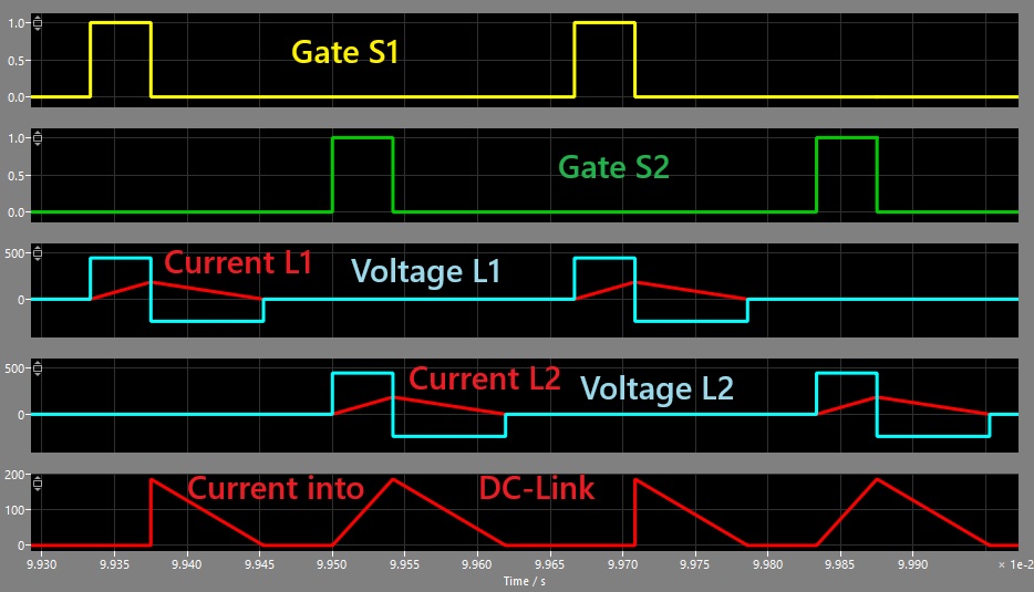 Looking at the two inductor-currents, everything seems fine, but when looking at the current into the upper DC-link, we can see that there is some kind of overlayed current with 100% current of inductor L2 and only parts of inductor L1. So I separated the total current into individual components and came up with the following parts A to D: