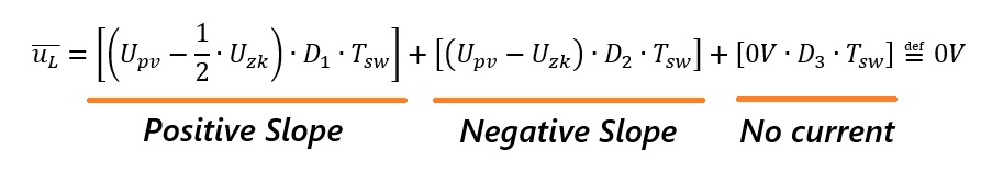 In this equation we have three dependencies: the current-ripple, which can be calculated, but two different times D1 and D2, while D3 is multiplied with 0A. Looking at the timing-diagram of a single inductor again, we can write another equation, that helps us to find an equation for D2 based on D1: the inductor-voltage