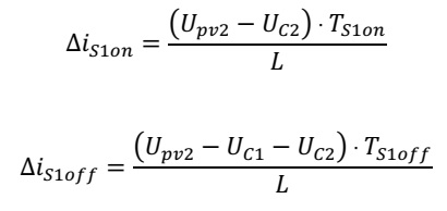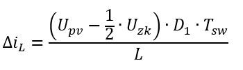 For the current-ripple we can assume, that the voltages on both capacitors Uc1 and Uc2 are the same, so we have 50% of the DC-link voltage over each of these two capacitors. So we can write the equation for the current like this: