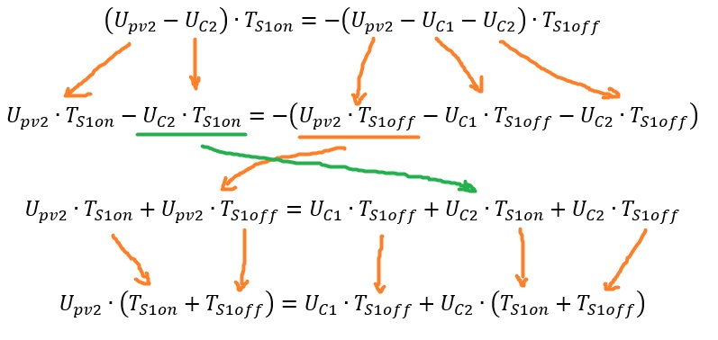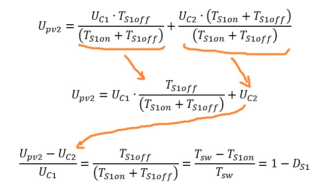 Since calculating the duty cycle was my goal, I started with the voltages of the two states: during switch S1 turned on and the other during turn-off-state: