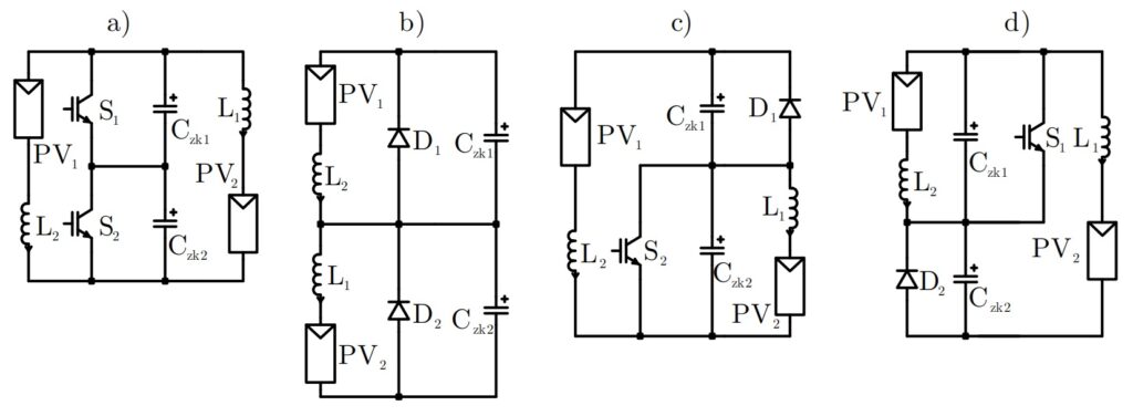 The basic idea here is, that two isolated DC-sources like two PV-panels or batteries are connected in a way, that they can be put in series or in parallel – or between when using high-frequency switches. There are two switches, that are turned on and off with a phase-shift of 180°: