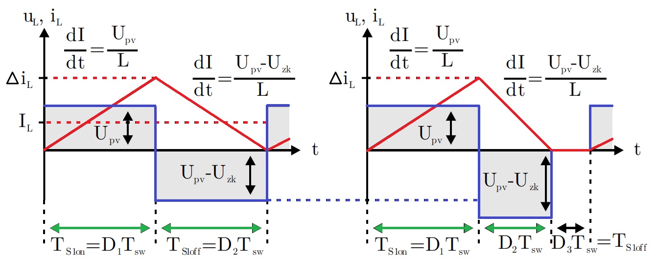 For calculating the duty cycle, only that parts of the current are important for us that are not equal to 0A and that’s connected to the switch we can control. The desired equation for the duty cycle should ensure the desired voltage-transmission ratio even when the current behaves like shown above. So lets have a look at the timing-diagram again, but now for both, continuous operation (left) and discontinuous operation (right). We have to consider part D1 for the positive slope and part D2 for the negative slope. Part D3 can be omitted for the current as it does not contribute to the energy-transfer, but it has to be taken into account regarding the timing: