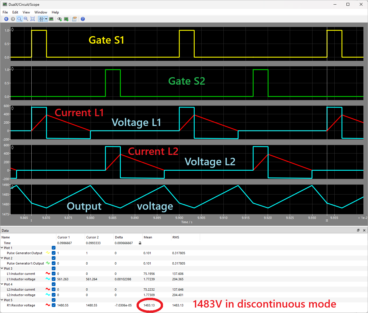 … and we are receiving 1483V even within the discontinuous mode – that’s what we want. Finally we have equations for both the continuous and the discontinuous operation of this special circuit, what a ride!