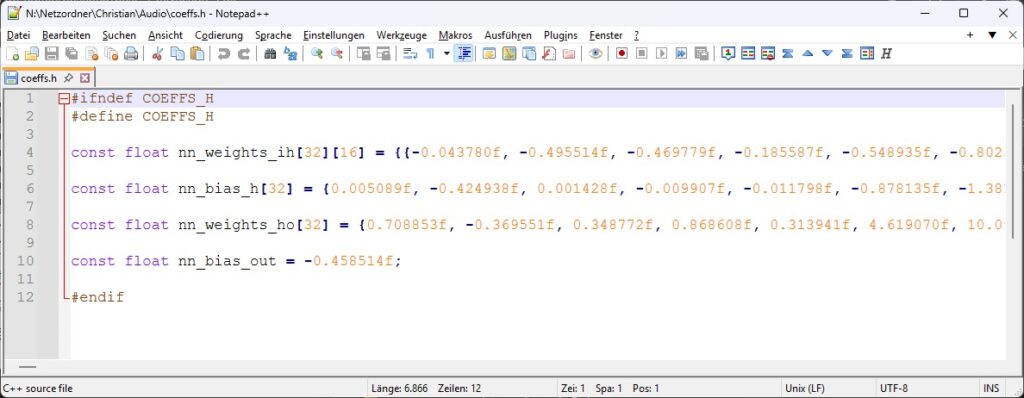 bias_Output = model.fc2.bias.data.numpy()[0]Finally I was able to export these coefficients into a header-file for the SHARC DSP: