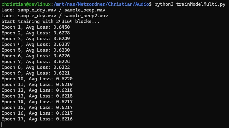 float probability = 1.0f / (1.0f + expf(-logit));Based on this probability I should be able to control my audio-gate. If the probability is below a threshold, the gate should be open, otherwise the gate should be closed to mute the feedback – quite harsh method, but hey, this is my first AI-based audio-filter 🙂