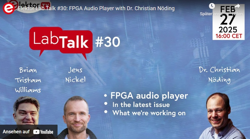 Join Elektor editors Brian Tristam Williams and Jens Nickel for the Lab Talk, where we’ll explore FPGA-based audio processing with Dr. Christian Nöding. We’ll discuss Christian’s FPGA audio player project and touch on other related topics, including audio latency and Bluetooth LE What’s on the agenda?